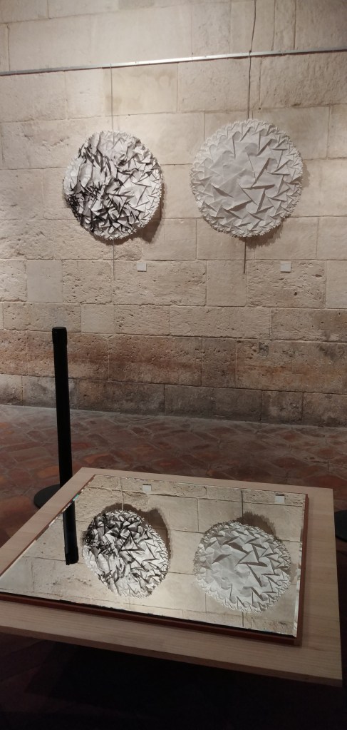 A través dels plecs la peça pintada varia lleugerament o completament, i agafa un altre aspecte visual. La llum reforça la geometria, i també ajuda a suggerir noves formes i a comprendre la laboriositat del treball, sovint compartit, i que a través de la cinestèsia (treball fet amb les mans) i la repetició de plecs i patrons ens ha portat a centrar-nos en nosaltres mateixos, com en una meditació.